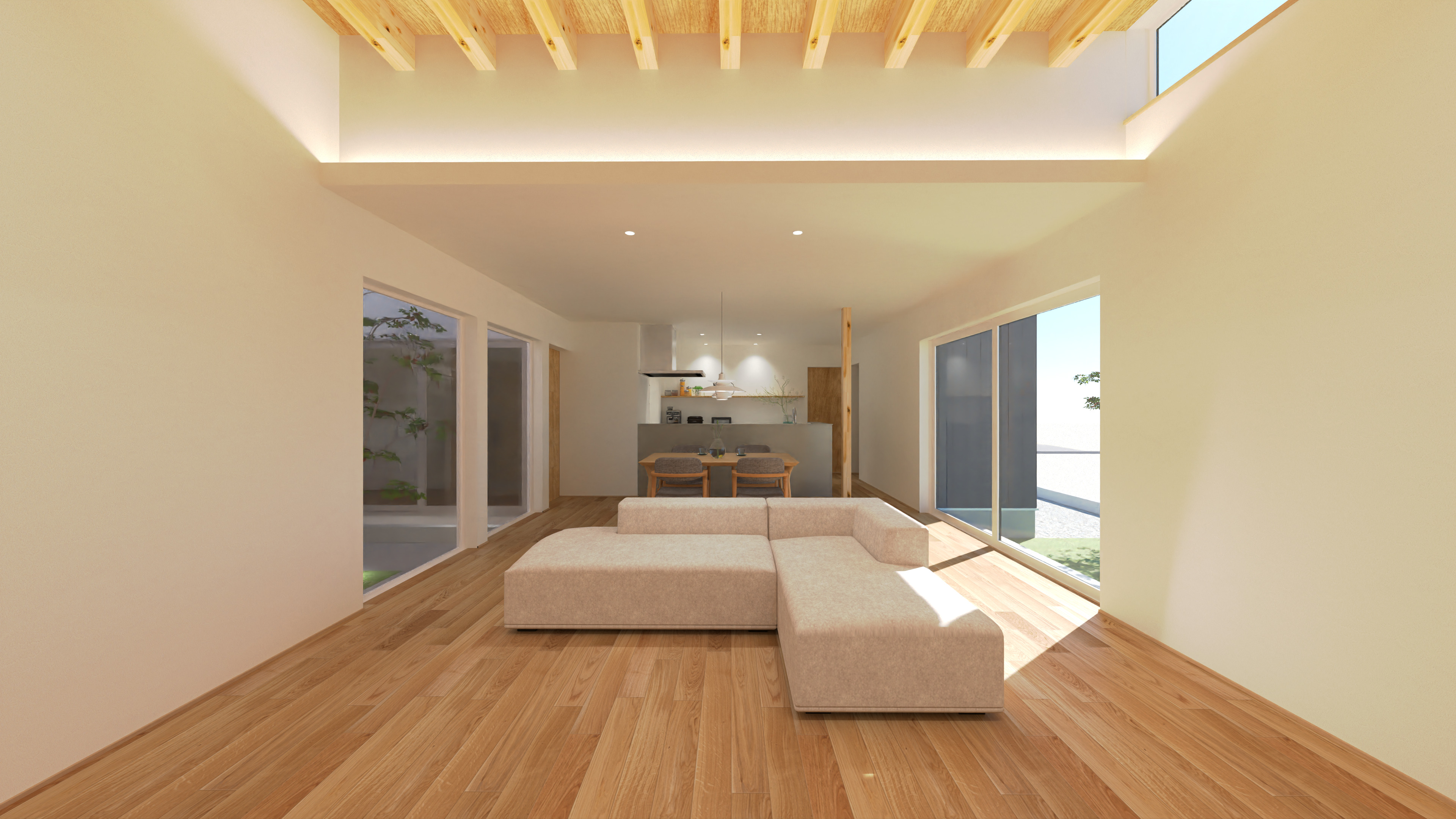 平屋は天井を高くしたり、勾配天井にしたりと、垂直方向への広がりを自由に設計できます。