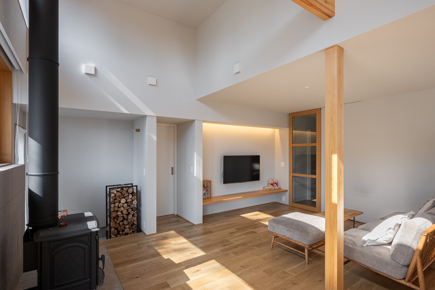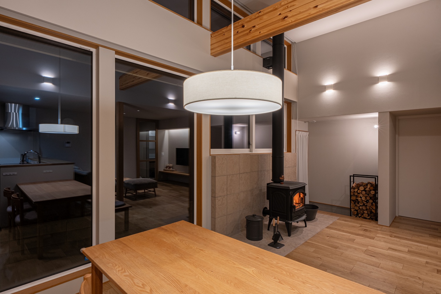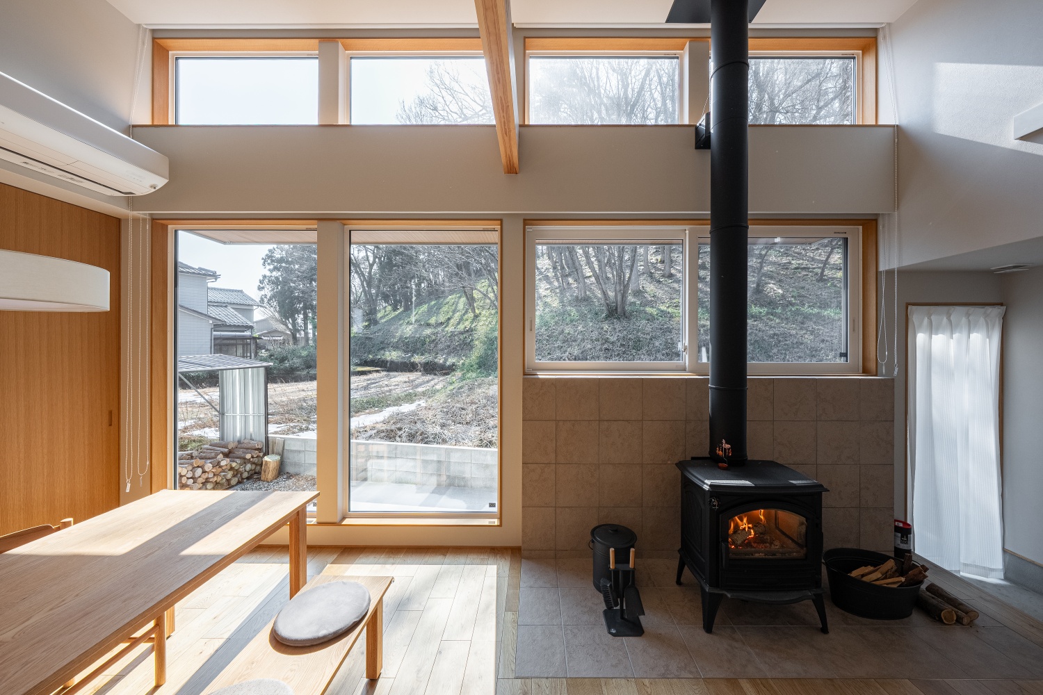 豊かな緑の能美古墳群が目の前に広がる敷地です。大きく開けた窓からは四季の移ろいを感じることができ、空間に彩りをもたらします。薪ストーブの炎と外部の景色がゆったりとした時間を演出します。豊かさとは人それぞれですが、施主様にとっての豊かさを考えた寄り添うことができるオウチです。