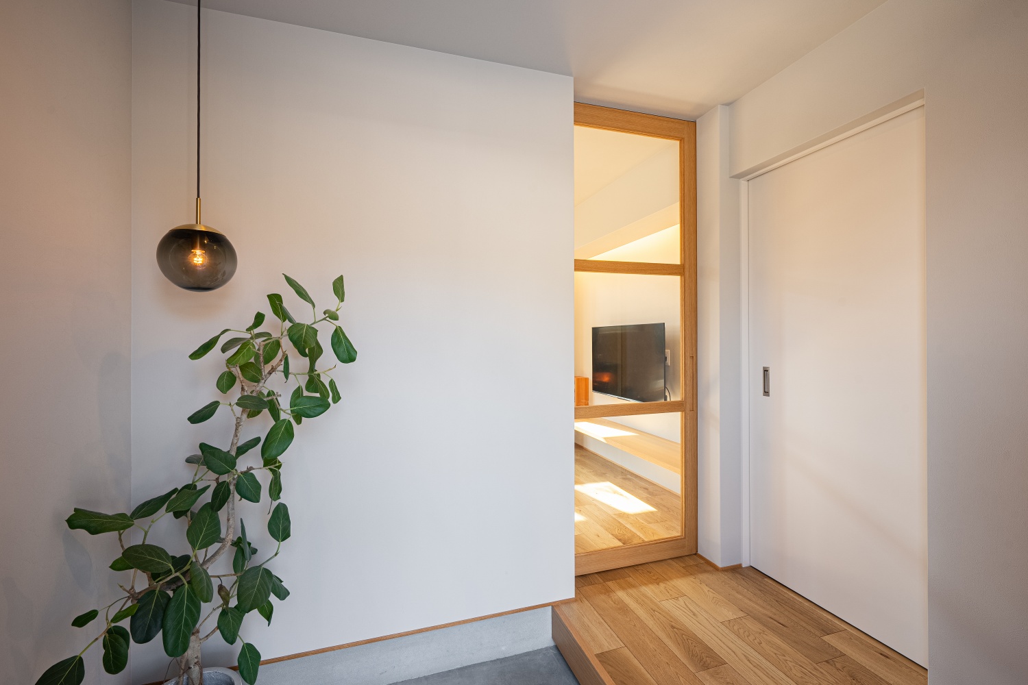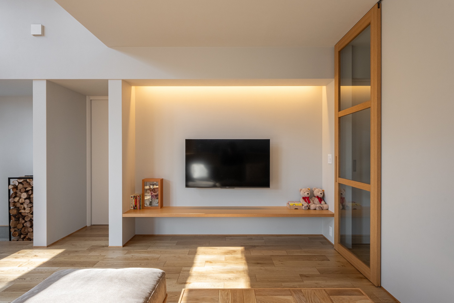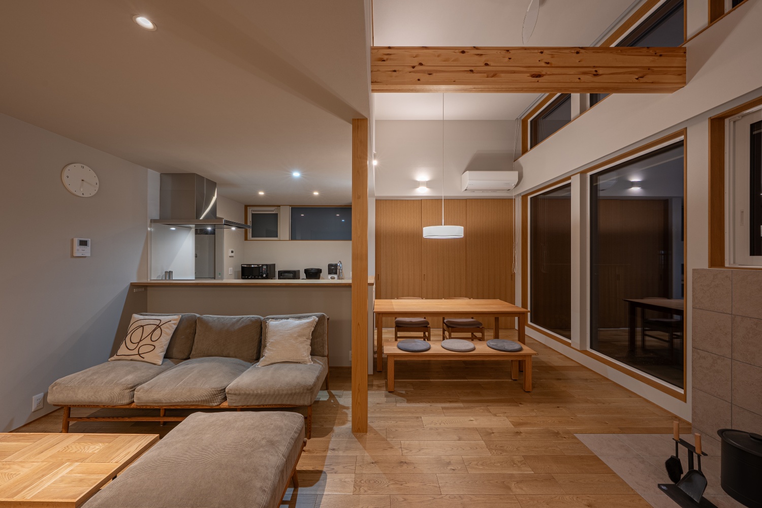 豊かな緑の能美古墳群が目の前に広がる敷地です。大きく開けた窓からは四季の移ろいを感じることができ、空間に彩りをもたらします。薪ストーブの炎と外部の景色がゆったりとした時間を演出します。豊かさとは人それぞれですが、施主様にとっての豊かさを考えた寄り添うことができるオウチです。